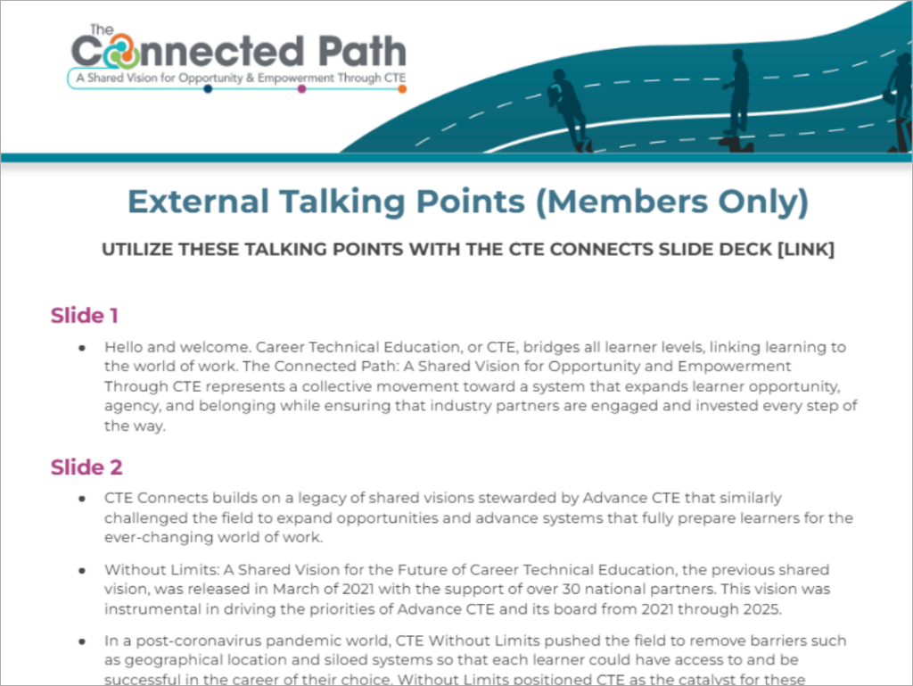 An Advance CTE members-only resource designed to support CTE leaders in presenting the six principles and action steps in their state, institutions, or program.