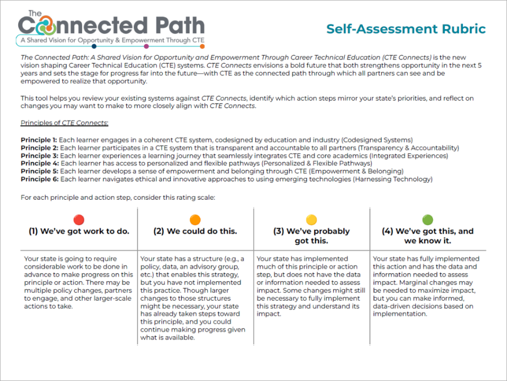 A short self-assessment rubric CTE leaders can use to gauge their current CTE program against the shared vision for the future of CTE and plan their next steps to build the connected path.