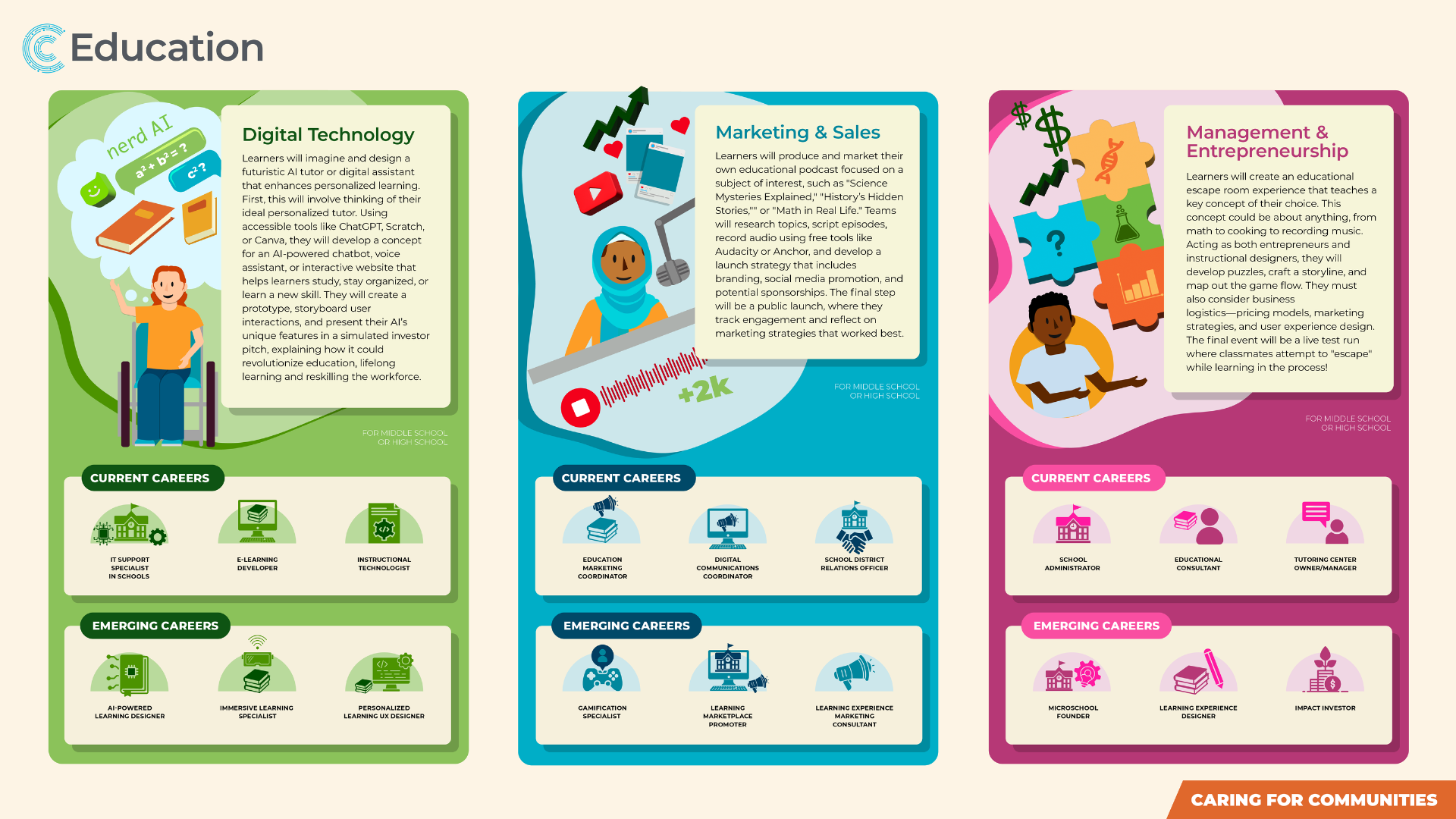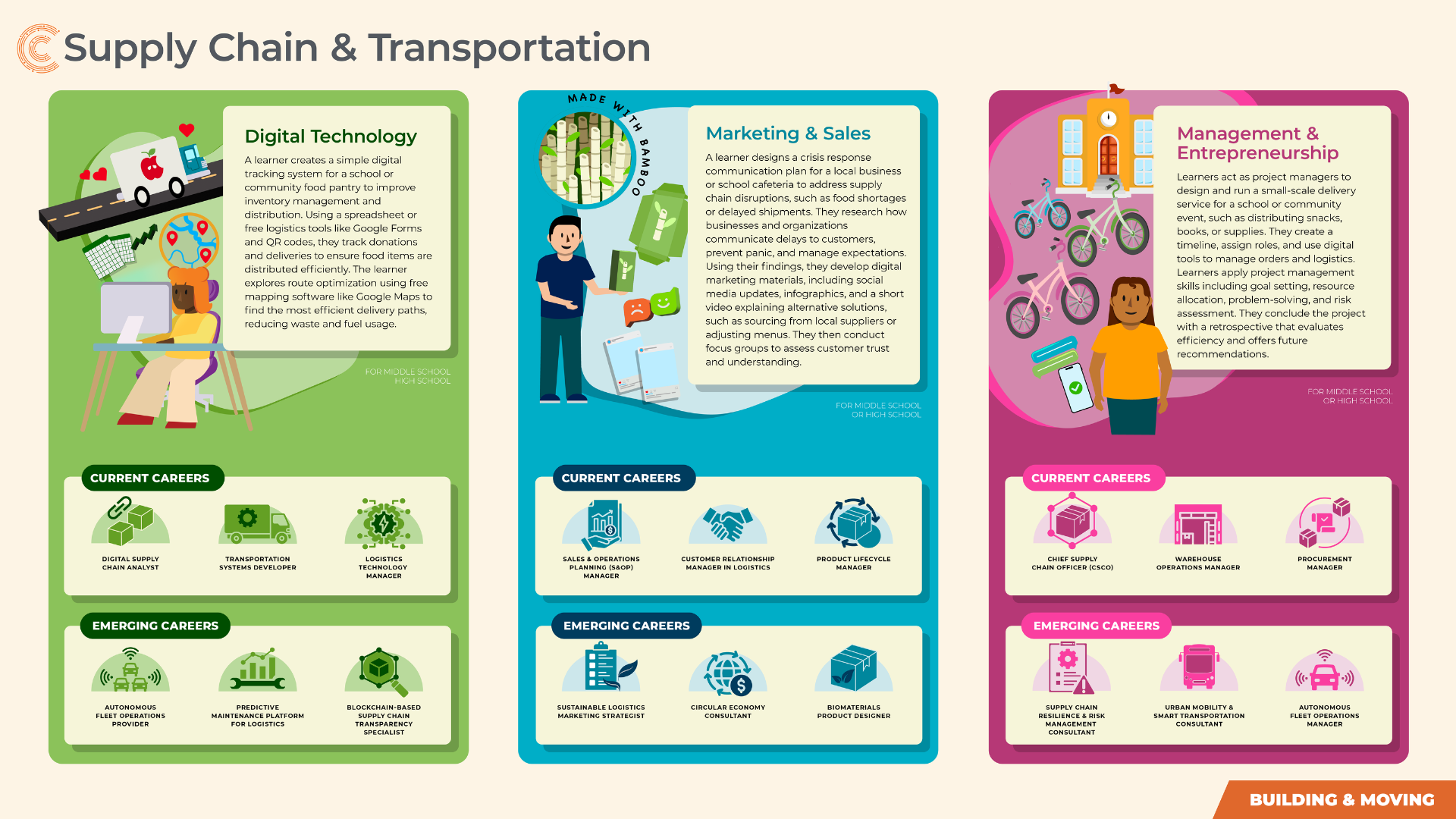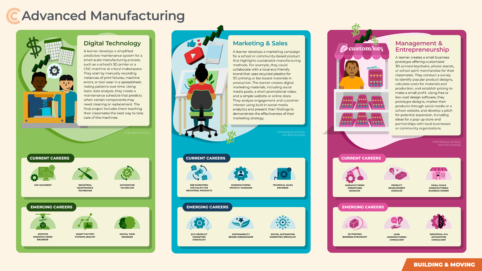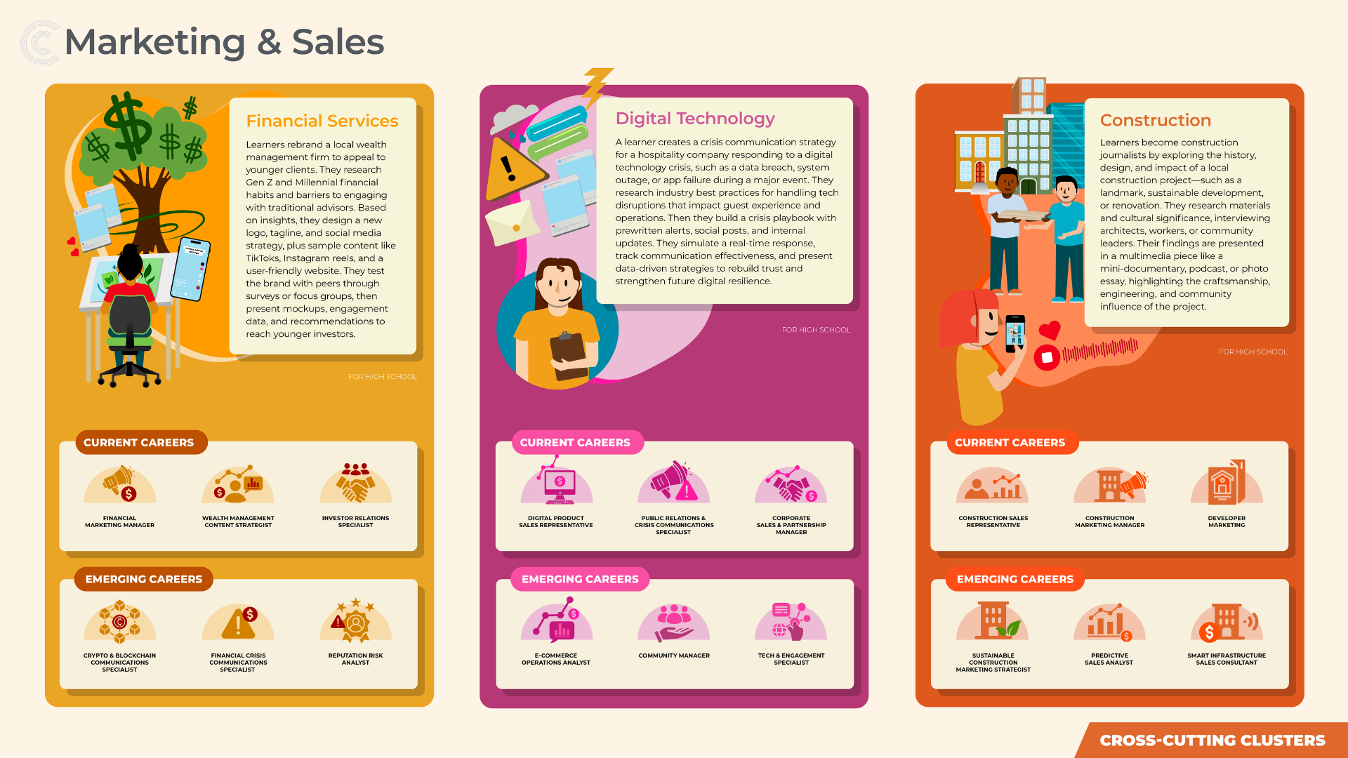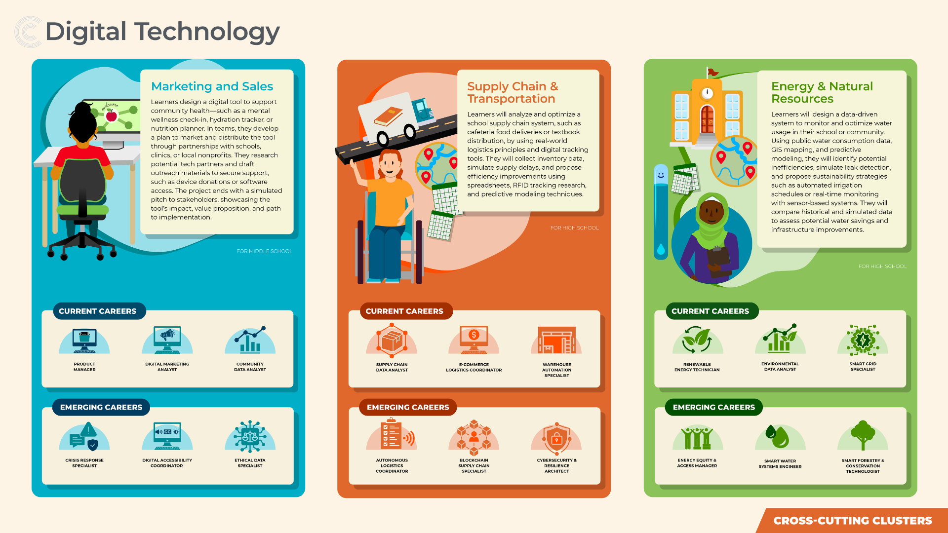 This resource, developed in partnership with Getting Smart, provides a classroom tool in alignment with 14 the Career Clusters of the modernized National Career Clusters Framework. Each one-pager provides project ideas for CTE educators and professionals to use in classrooms and work-based learning settings to develop industry-sector specific skills, while also integrating interdisciplinary skills that occur across all career paths through the three Cross-Cutting Sectors – Digital Technology, Marketing & Sales, and Management & Entreprenuership.