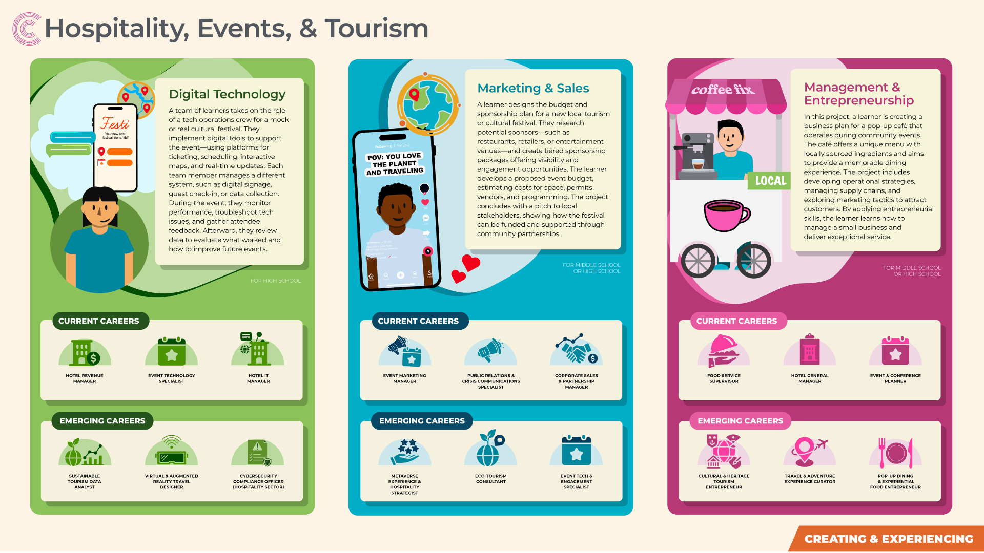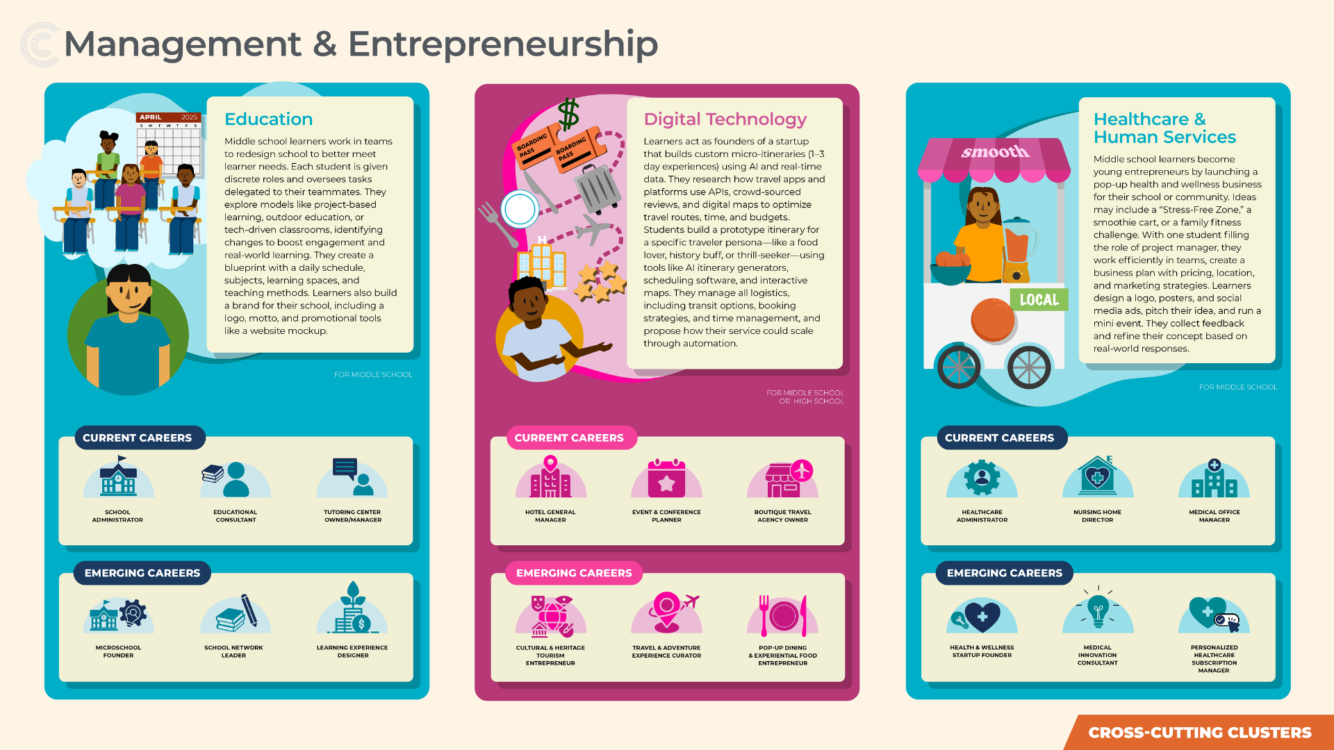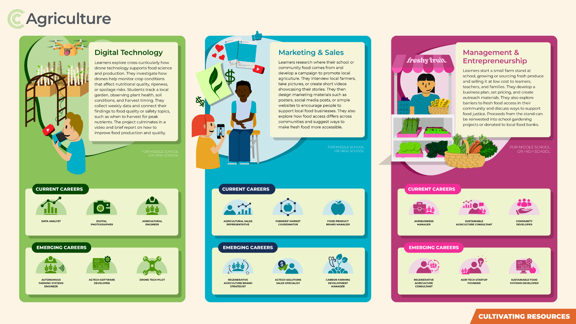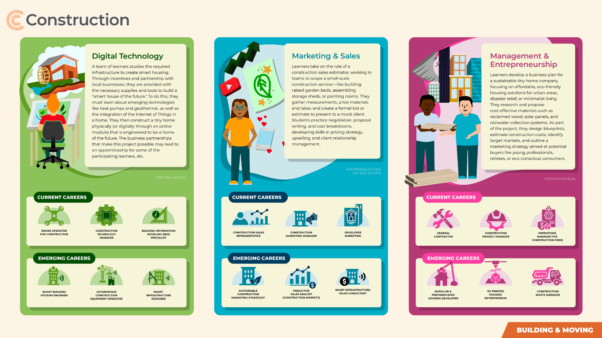 This resource, developed in partnership with Getting Smart, provides a classroom tool in alignment with 14 the Career Clusters of the modernized National Career Clusters Framework. Each one-pager provides project ideas for CTE educators and professionals to use in classrooms and work-based learning settings to develop industry-sector specific skills, while also integrating interdisciplinary skills that occur across all career paths through the three Cross-Cutting Sectors – Digital Technology, Marketing & Sales, and Management & Entreprenuership.