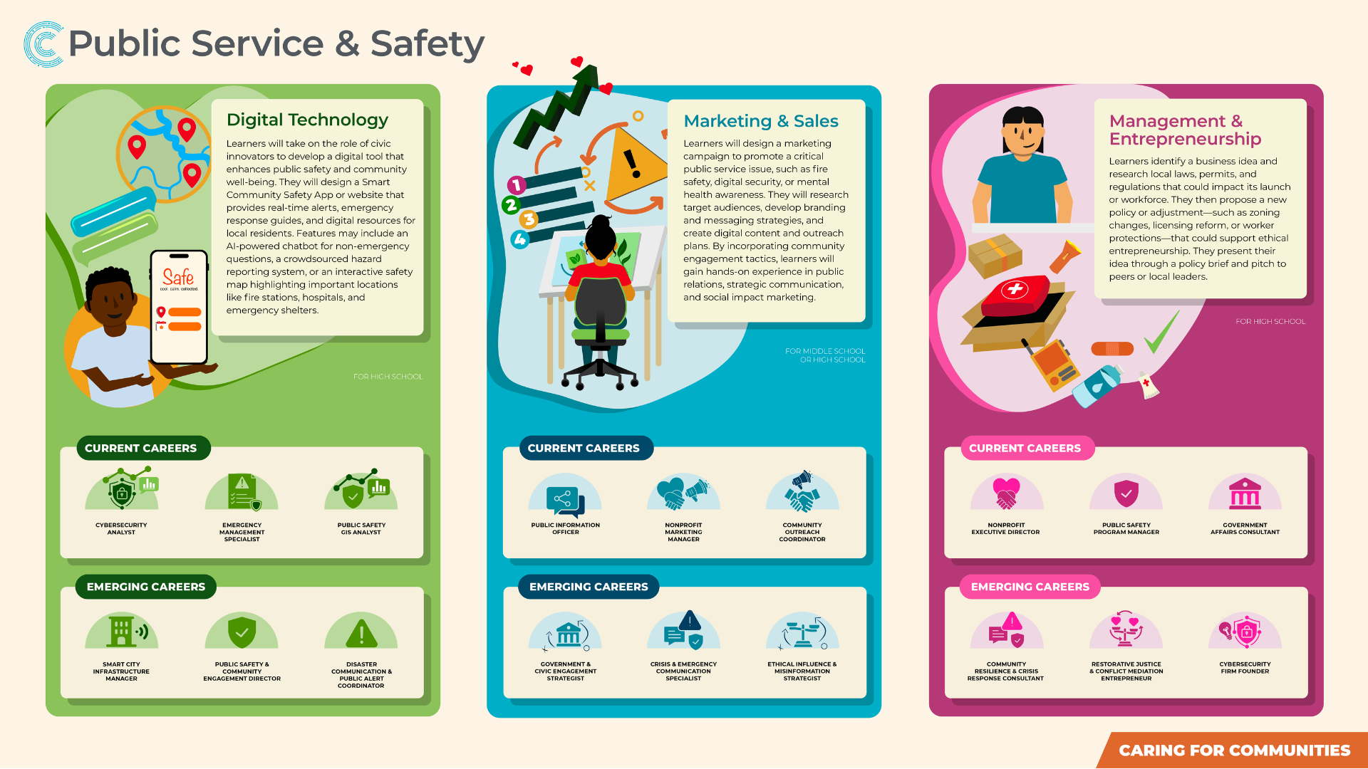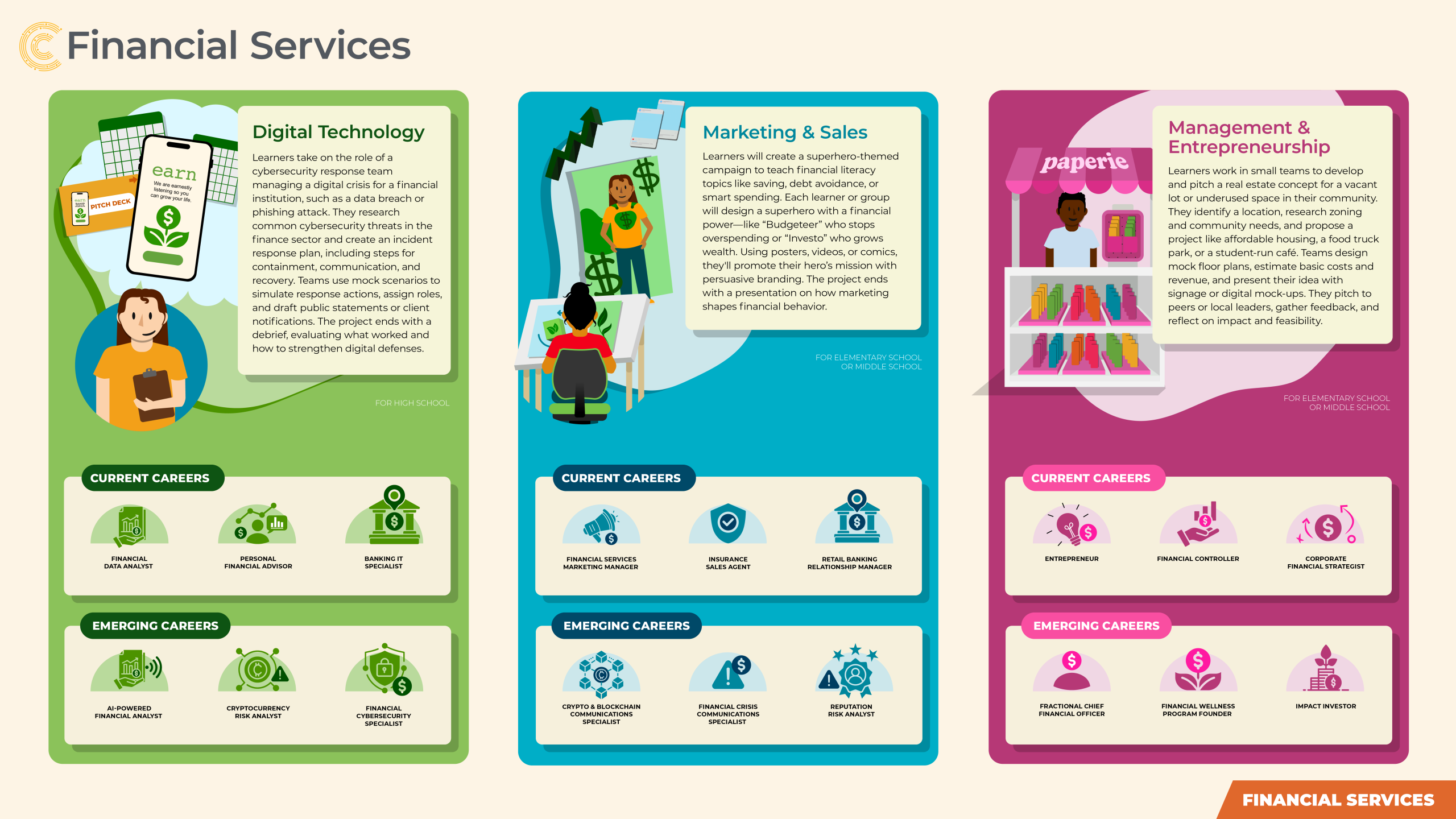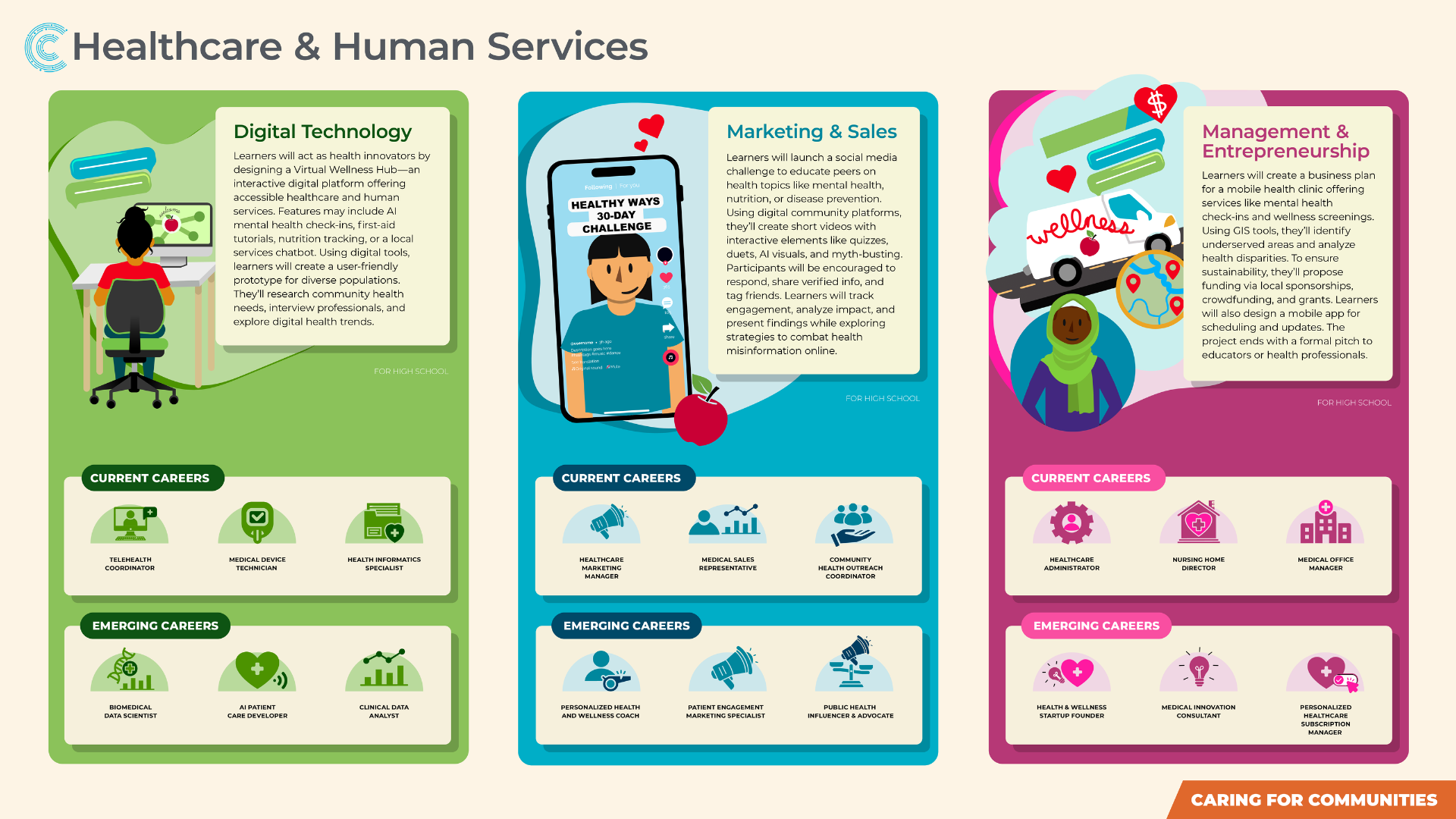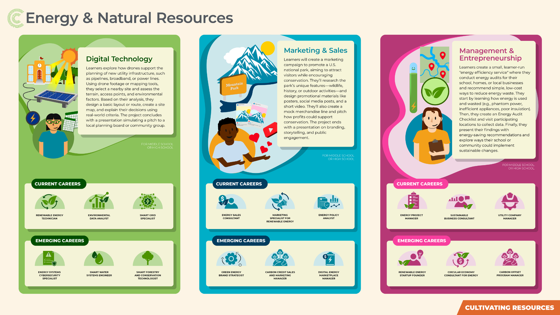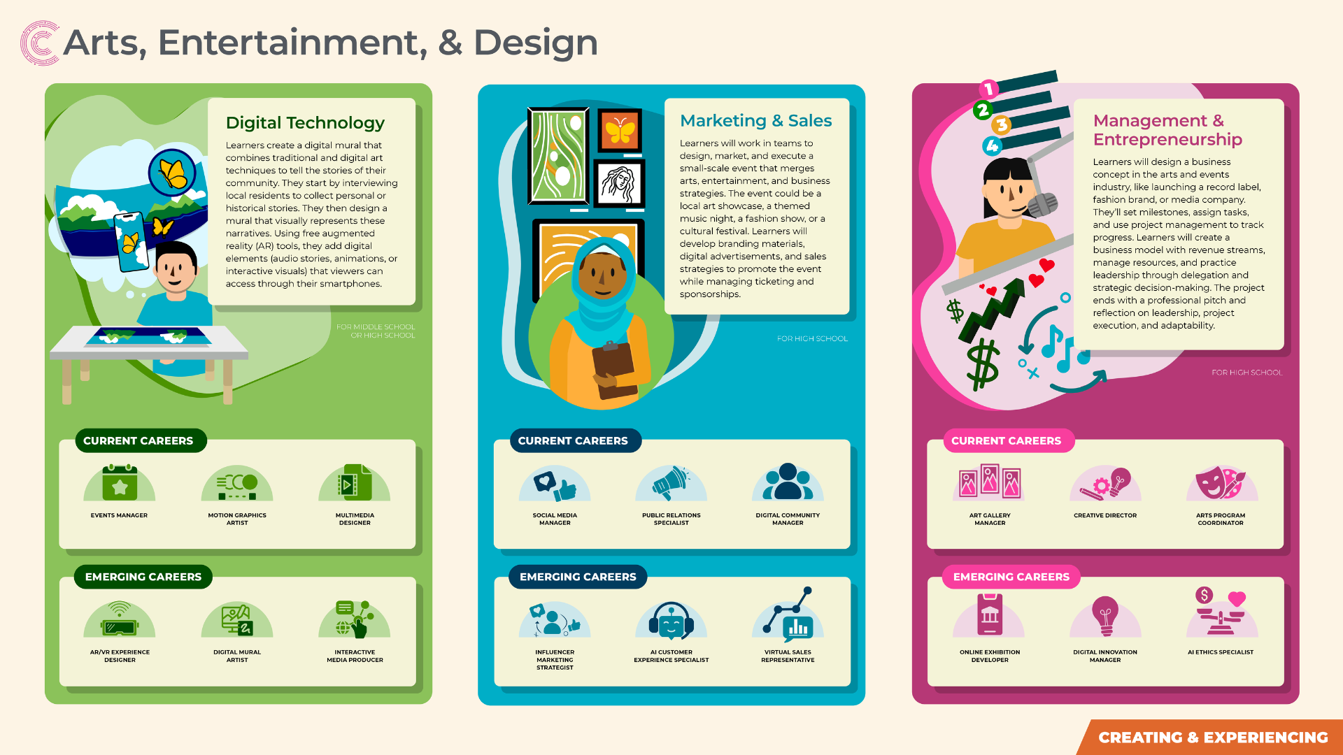 This resource, developed in partnership with Getting Smart, provides a classroom tool in alignment with 14 the Career Clusters of the modernized National Career Clusters Framework. Each one-pager provides project ideas for CTE educators and professionals to use in classrooms and work-based learning settings to develop industry-sector specific skills, while also integrating interdisciplinary skills that occur across all career paths through the three Cross-Cutting Sectors – Digital Technology, Marketing & Sales, and Management & Entreprenuership.
