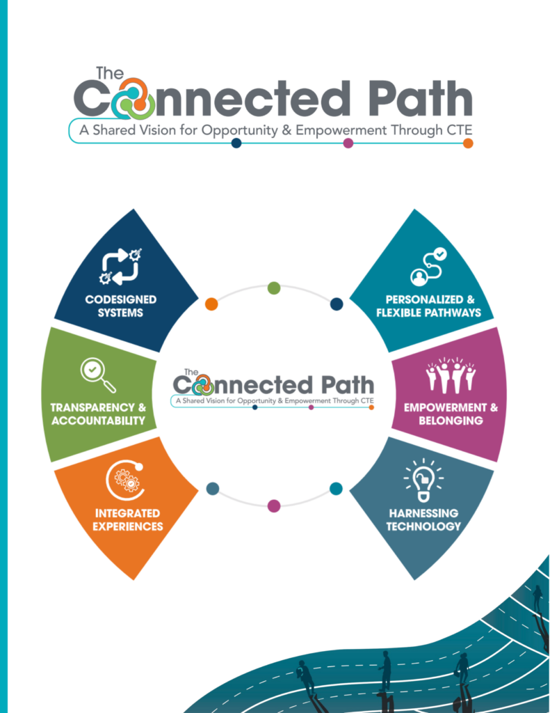 The Connected Path: A Shared Vision for Opportunity and Empowerment Through CTE (CTE Connects) envisions a bold future toward a career readiness ecosystem that expands learner opportunity, agency, and belonging, while ensuring that industry partners are not only engaged but invested every step of the way. CTE Connects challenges education and industry to codesign and champion systems that center the learner experience, reimagine partnership across learner levels and sectors, and strengthen outcomes for all CTE partners. The six interconnected principles of CTE Connects represent the priority areas of focus for CTE leaders, employers, and policymakers to improve opportunities for and to empower all learners within their state. CTE Connects was developed through a highly collaborative, cross-sector process to ensure it reflects and benefits learners, educators, CTE leaders, employers, and national partners.