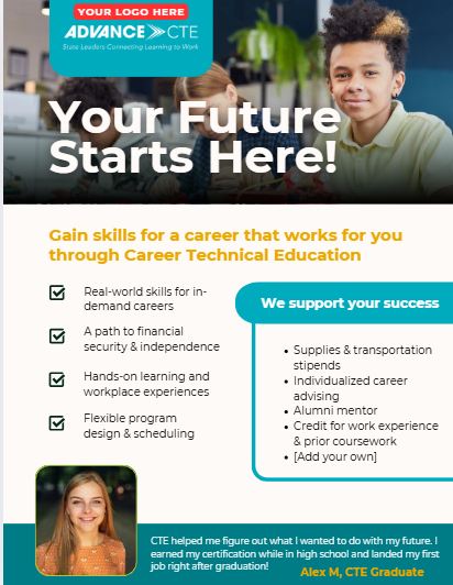 This template, hosted through Canva, provides a ready-made design in the format of a flyer card for use by educators, school counselors and career advisors, state and local CTE leaders, and community partners. The template includes messages about the value of CTE informed by recent national perceptions research conducted by Advance CTE from 2023 to 2025.