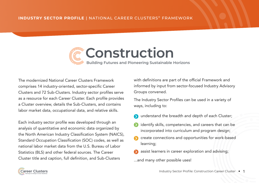 The modernized National Career Clusters® Framework comprises 14 industry-oriented, sector-specific Career Clusters and 72 Sub-Clusters. This industry sector profile (ISP) compiles key industry-connected content about the Construction Career Cluster in a digestable format. This resource allows learners, educators, and career advising professionals to build connections among potential career paths and necessary skills, current and emerging careers, labor market information, and key occupation groupings within the Construction Career Cluster.