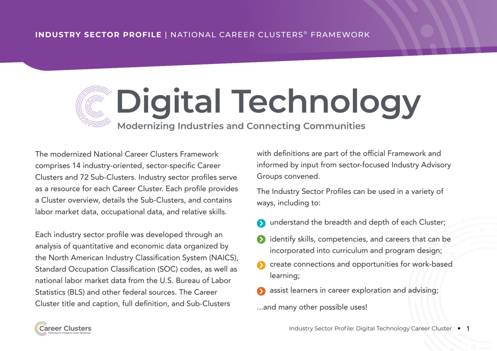 The modernized National Career Clusters® Framework comprises 14 industry-oriented, sector-specific Career Clusters and 72 Sub-Clusters. This industry sector profile (ISP) compiles key industry-connected content about the Digital Technology Career Cluster in a digestable format. This resource allows learners, educators, and career advising professionals to build connections among potential career paths and necessary skills, current and emerging careers, labor market information, and key occupation groupings within the Digital Technology Career Cluster.