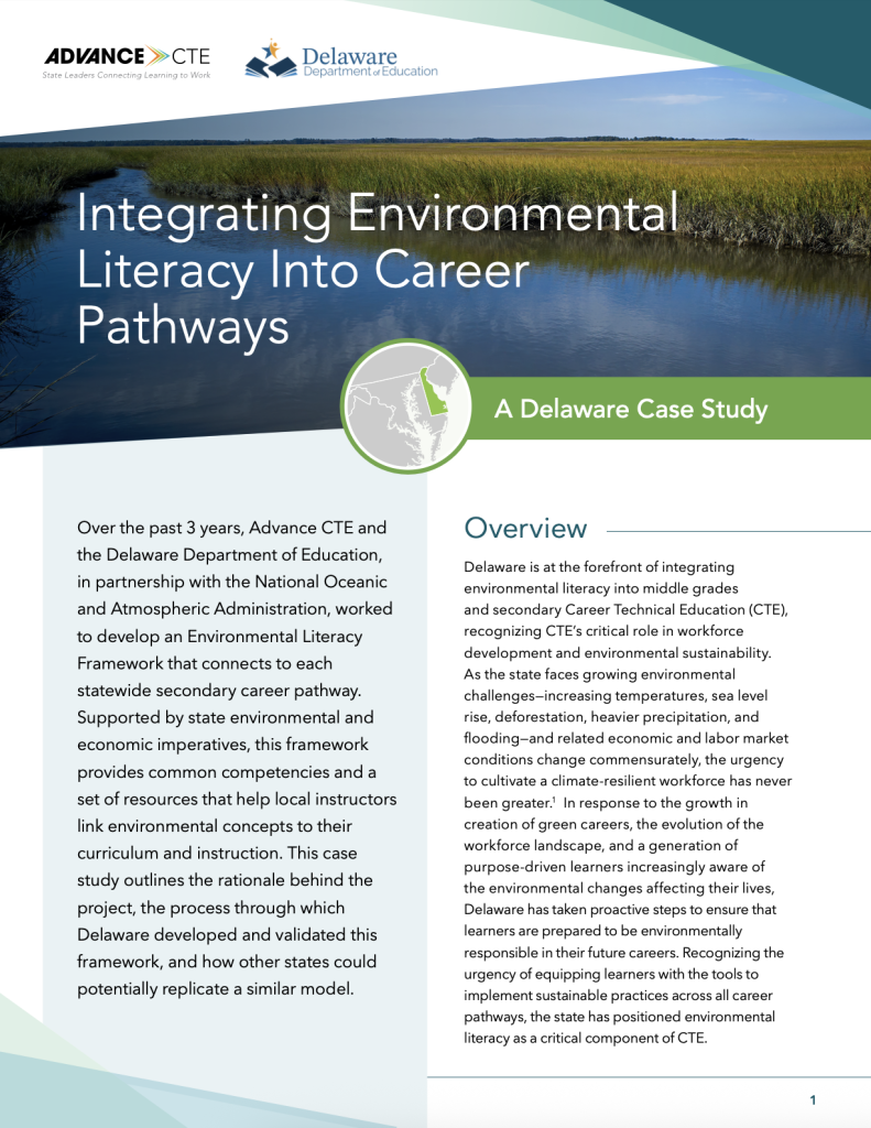 The case study highlights Delaware’s work in integrating environmental literacy standards into career pathways. In doing so, it provides a process and model for other state education and workforce leaders across the country to consider how to incorporate emerging skill areas into CTE programs of study that are regionally relevant for industry needs and learner values.